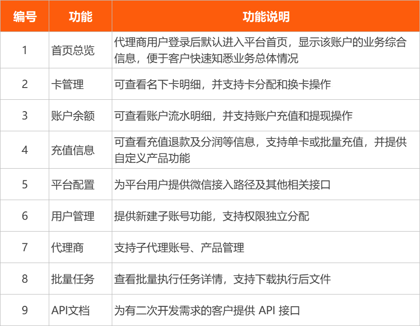 量訊物聯深耕蜂窩物聯行業多年,根據市場及渠道的特點,定制開發了適用B2B2C分銷模式的管理平臺。代理客戶可登陸管理平臺,進行卡管理、套餐充值、結算分潤、換卡、退款、新建用戶角色、配置公眾號等功能。實現售前、售后業務及分潤提現一站式管理。